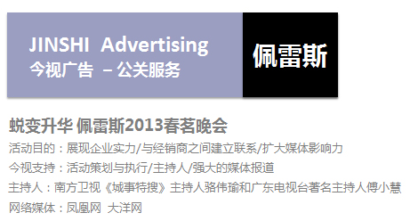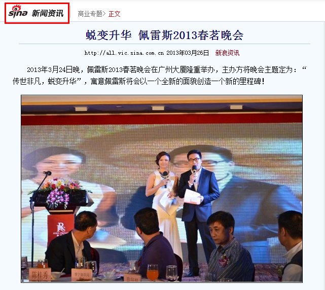 2013年3月24日晚,佩雷斯2013春茗晚会在广州大厦隆重举办,主办方将晚会主题定为:“传世非凡,蜕变升华”,寓意佩雷斯将会以一个全新的面貌创造一个新的里程碑!