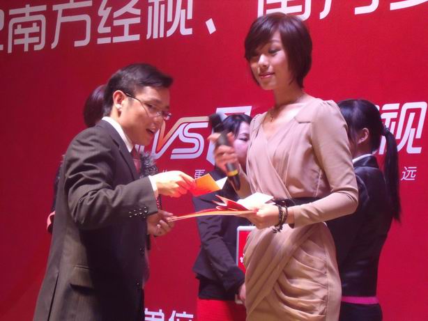 ![]() 我司领导肖建科总经理上台领取“2012年南方电视台经视频道、少儿频道广告一级代理公司”荣誉牌匾。