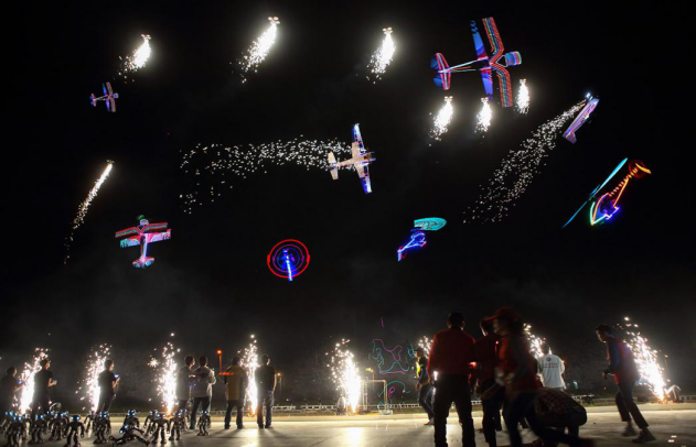 广东汕头澄海举行“新城市·梦飞翔”澄海航模夜航表演,来自汕头市航模协会的几十名航模爱好者依次为国内外观众、汕头市民献上自制“笑脸机”“电动纸飞机”、“飞行灯笼”,固定翼(双翼)特技飞行、编程直升机特技飞行、大滑翔机空中拉烟花、固定翼双机花式表演、坦克飞机地空作战等多机种、多队形、多样式的飞行表演。